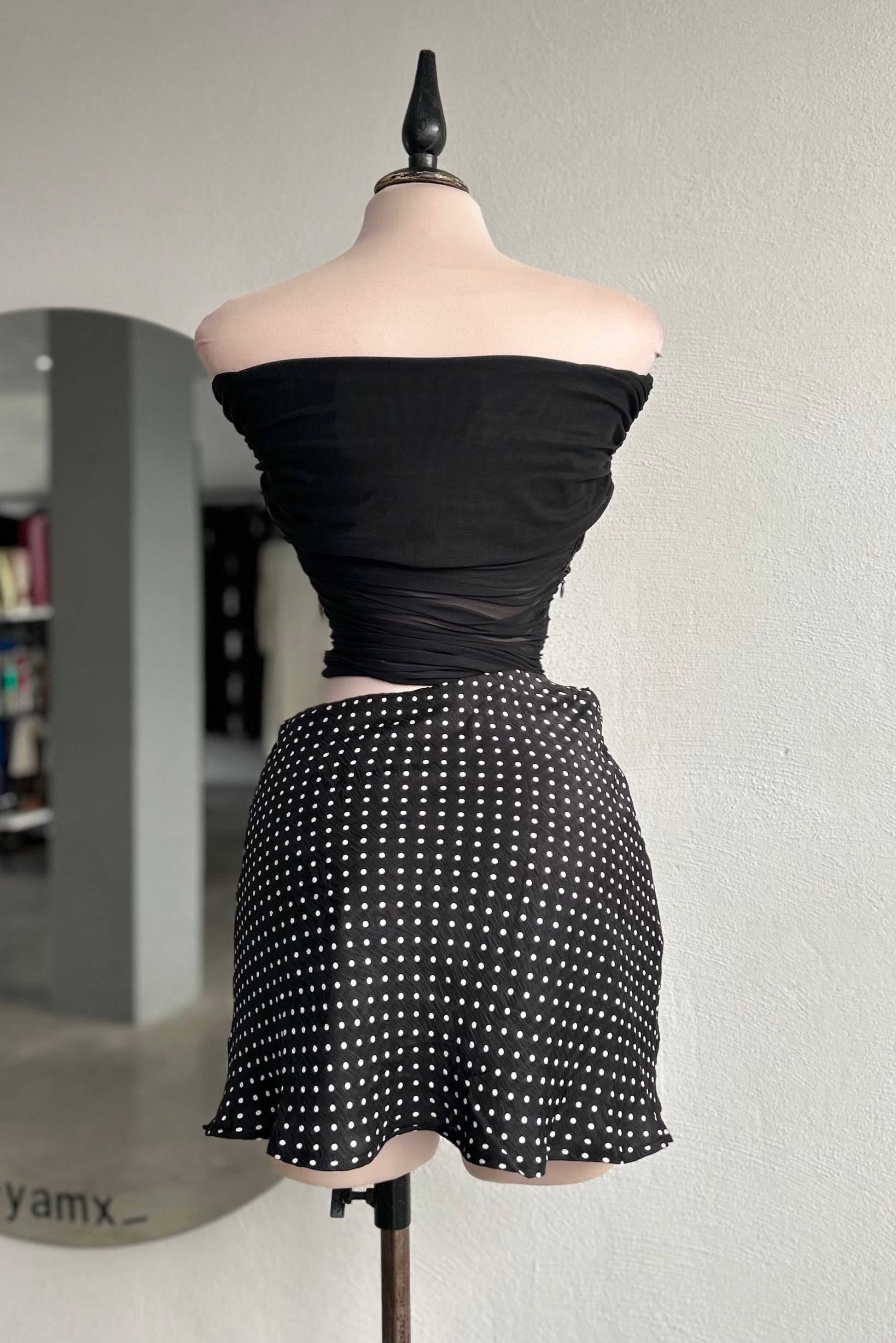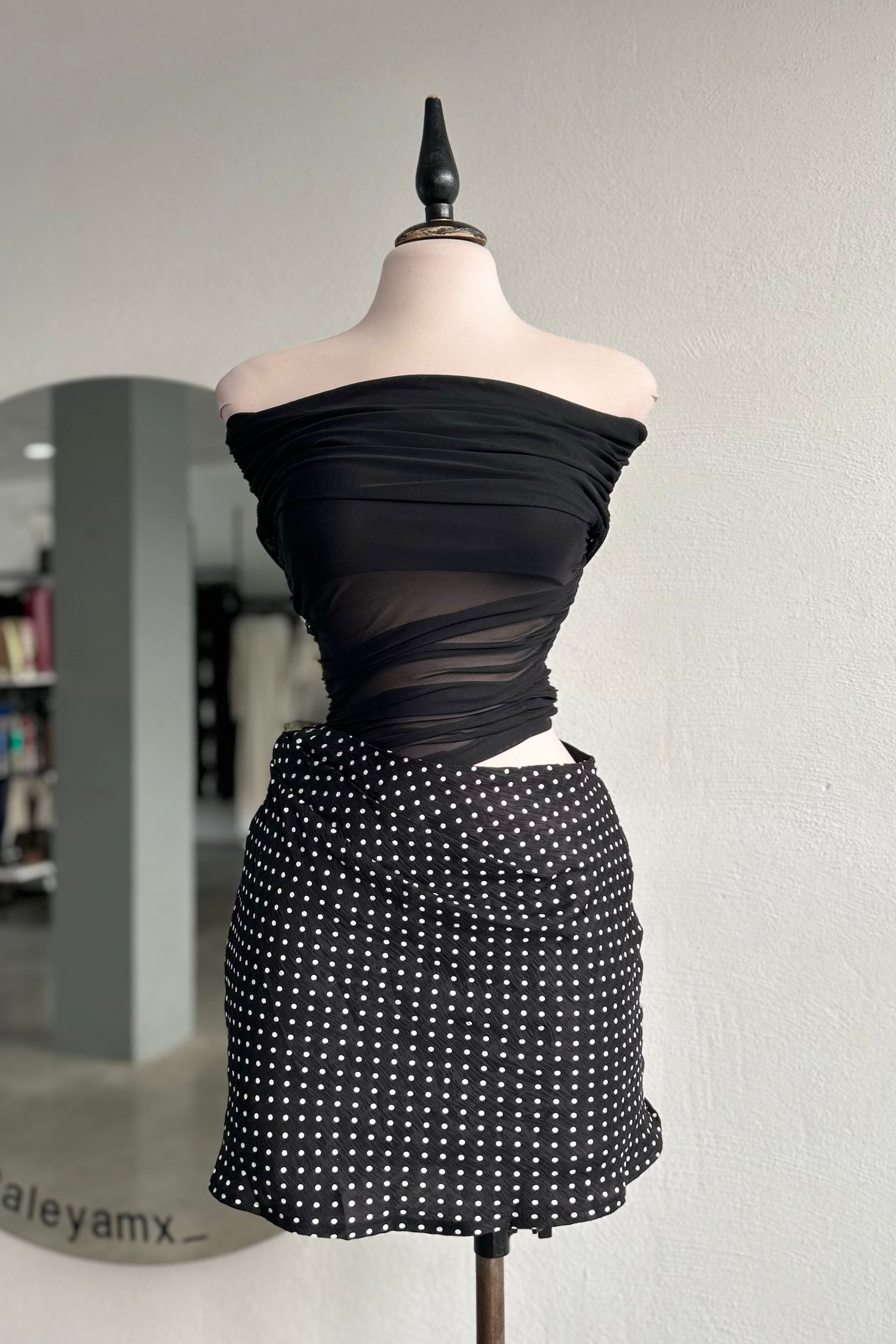 Vestido corto con abertura en cintura, parte de arriba mesh con forro en top, cierre en un costado